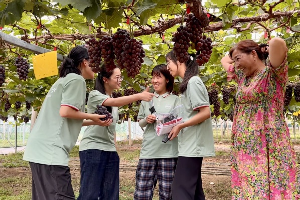 “當(dāng)年習(xí)總書(shū)記囑托我們:現(xiàn)代高效農(nóng)業(yè)是農(nóng)民致富的好路子,要沿著這個(gè)路子走下去。”四季春農(nóng)業(yè)園負(fù)責(zé)人葉明蘭對(duì)實(shí)踐團(tuán)隊(duì)說(shuō)道。現(xiàn)代農(nóng)業(yè)講求高效,實(shí)踐團(tuán)隊(duì)了解到世業(yè)鎮(zhèn)每一位像葉明蘭一樣的農(nóng)業(yè)園主都有一個(gè)“小本本”,記錄的是農(nóng)業(yè)設(shè)施的更新?lián)Q代或保養(yǎng)維修提醒。葉明蘭邀請(qǐng)實(shí)踐團(tuán)隊(duì)進(jìn)入葡萄園進(jìn)行實(shí)地考察,實(shí)踐團(tuán)隊(duì)觀察到,四季春農(nóng)業(yè)園的葡萄大棚內(nèi)無(wú)雜草、葡萄掛果率高、質(zhì)量好。葉明蘭告訴實(shí)踐團(tuán),這得益于智能化、高科技農(nóng)業(yè)設(shè)備的引入,讓農(nóng)民能輕易知曉作物冷暖,打破“單純種、靠天收”的農(nóng)業(yè)高冷印象。在葡萄園中,葉明蘭向?qū)嵺`團(tuán)隊(duì)分享了自己通過(guò)自媒體直播方式打通線上銷售渠道的故事,實(shí)踐團(tuán)隊(duì)主動(dòng)提議,協(xié)助農(nóng)業(yè)園完成抖音視頻拍攝。
