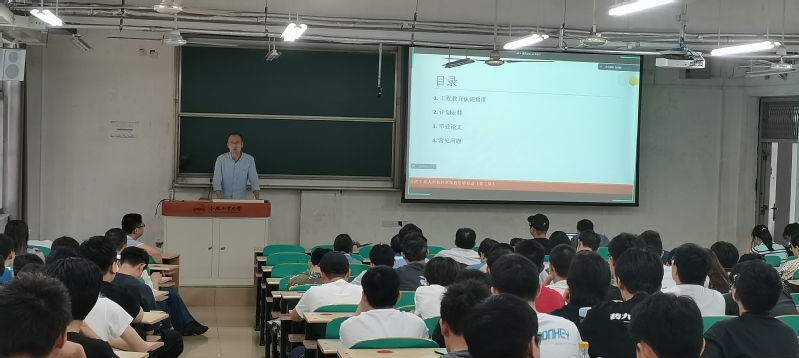 隨后,軟件工程系副主任張高峰老師首先從工程認(rèn)證角度介紹了畢業(yè)設(shè)計(jì)的培養(yǎng)目標(biāo)和對(duì)應(yīng)的畢業(yè)要求、畢業(yè)設(shè)計(jì)工作計(jì)劃安排以及結(jié)合畢業(yè)設(shè)計(jì)評(píng)審中常見的問題,如選題、題目、摘要、參考文獻(xiàn)等方面做了詳細(xì)解讀和說明。