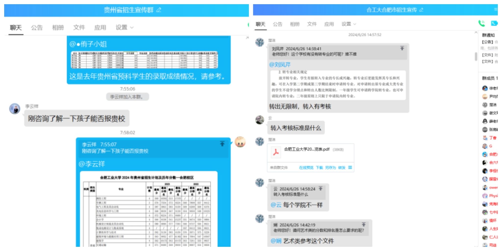 招生組線上咨詢小組的老師們負(fù)責(zé)合肥市QQ群(群人數(shù)達(dá)500人)和貴州省招生宣傳QQ群,耐心回復(fù)家長(zhǎng)和考生的問(wèn)題,回復(fù)消息近兩千多。微信公眾號(hào)開(kāi)通專(zhuān)人接聽(tīng)貴州省的招生咨詢電話和安徽省考生的固定電話,接聽(tīng)電話近三百人次,為廣大考生和家長(zhǎng)答疑解惑。
