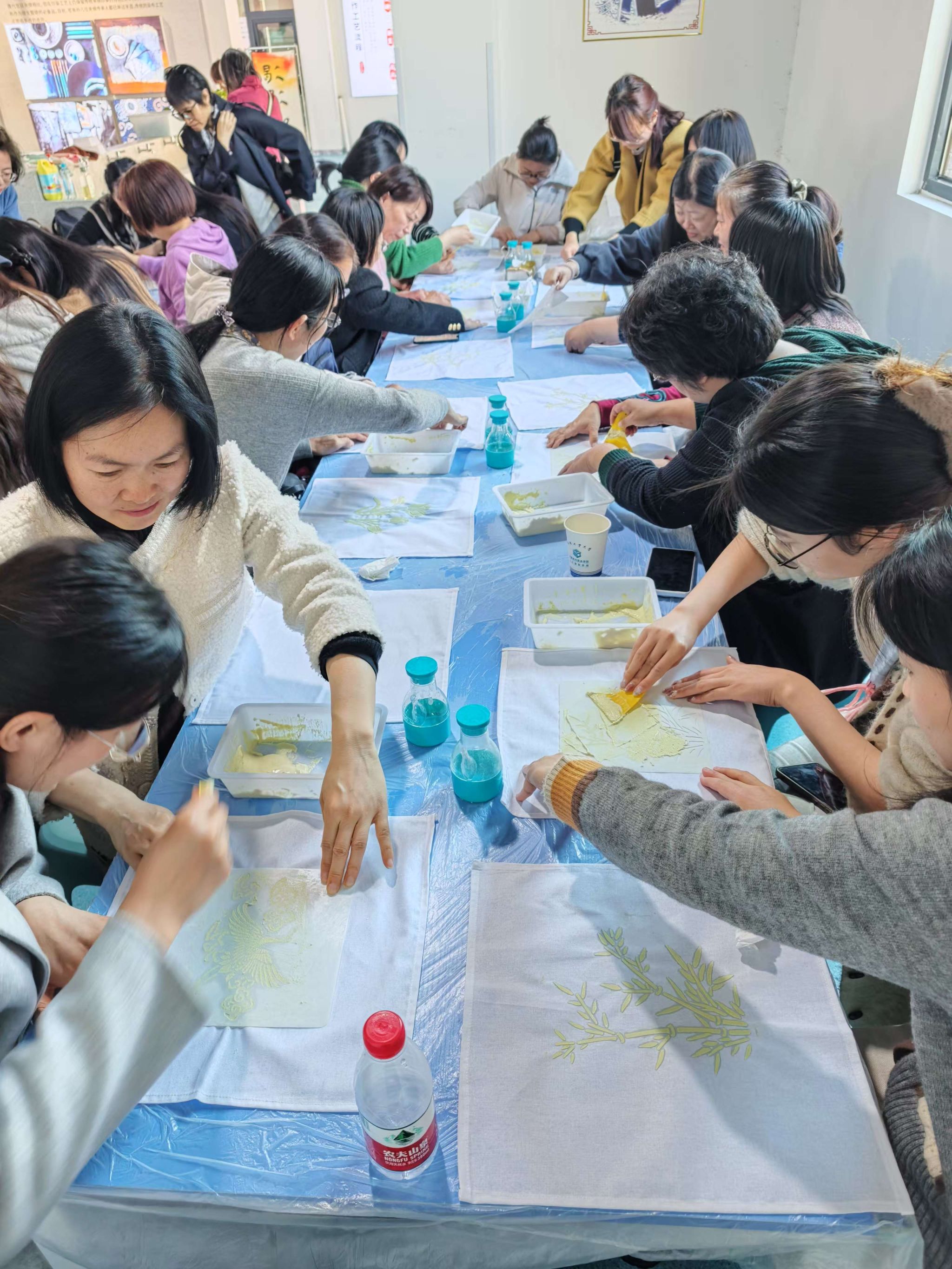 點茶之后,女教職工們轉(zhuǎn)戰(zhàn)古法扎染工坊。扎染是中國傳統(tǒng)的手工染色技藝,通過和粉、涂抹圖案,再進行染色,形成獨特的視覺效果。在扎染老師的指導(dǎo)下,大家發(fā)揮創(chuàng)意,先將粉末以水攪勻,再將水漿均勻抹面在布上,拓出圖案,接著將布料浸入染缸,再展開時,一幅幅藍白碰撞、圖案各異的布藝作品呈現(xiàn)在眼前,等曬干后,圖案便會成型。