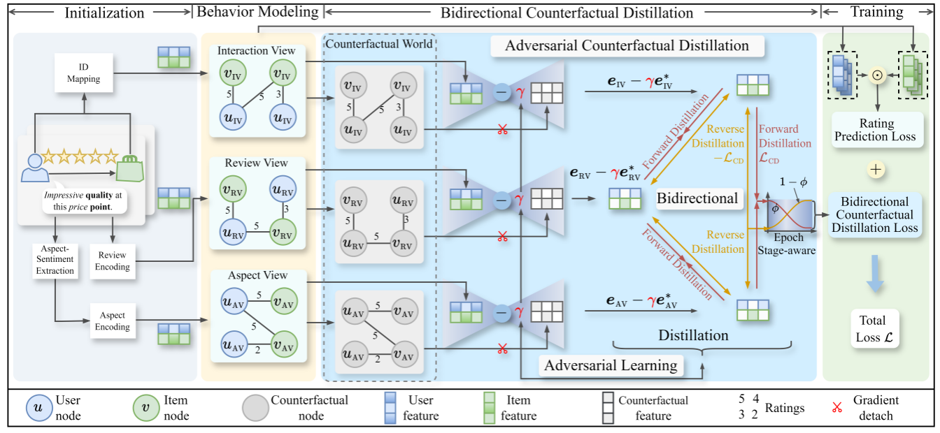 在推薦系統(tǒng)領(lǐng)域,博士生桑勝與課題組成員李書(shū)杰、李帥洋、劉康、李騰、賈偉、郭丹、薛峰(通訊)合作完成的論文《Bidirectional Counterfactual Distillation for Review-Based Recommendation》 被錄用。該研究針對(duì)現(xiàn)有基于評(píng)論的推薦方法在跨行為知識(shí)傳遞過(guò)程中存在的評(píng)級(jí)分布偏差污染與特征同質(zhì)化問(wèn)題,提出了一種全新的雙向反事實(shí)蒸餾框架,展現(xiàn)出卓越的去偏能力與跨行為知識(shí)共享性能。